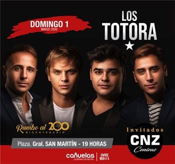 Este domingo, el Gobierno municipal continuará con las celebraciones oficiales con la programación del programa artístico “Rumbo al Bicentenario”. En la plaza San Martín, con entrada libre y gratuita los vecinos y visitantes podrá disfrutar del show de Los Totora, grupo que cuenta con cinco discos editados, los primeros tres de forma independiente y los dos últimos, bajo el sello de Warner Music.