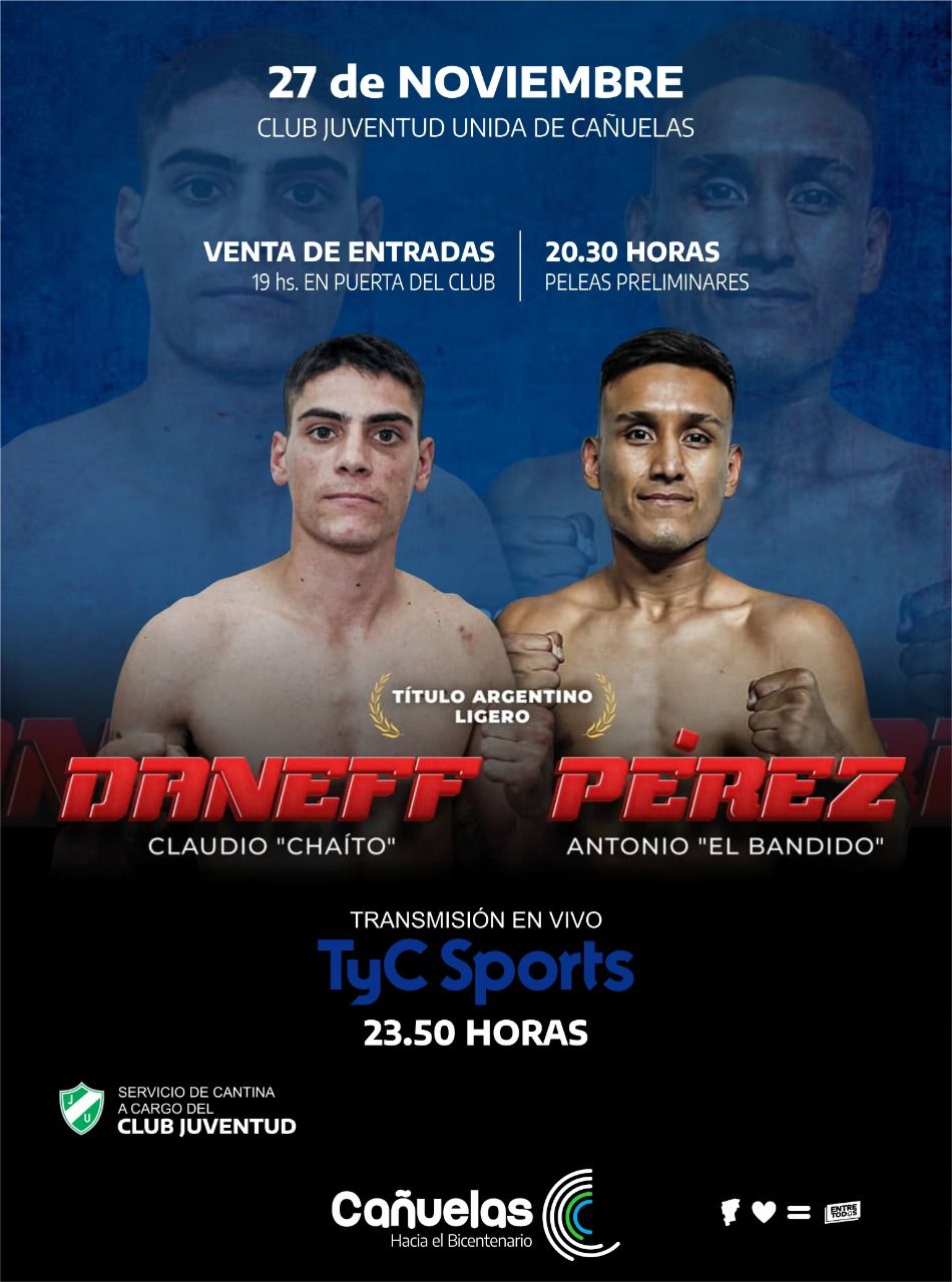 Con auspicio del Gobierno Municipal, el próximo sábado 27 se realizará en el estadio Vicente Polítano del Club Juventud Unida, una velada boxística en la que el púgil cañuelense Claudio “Chaíto” Daneff expondrá su título argentino ligero.