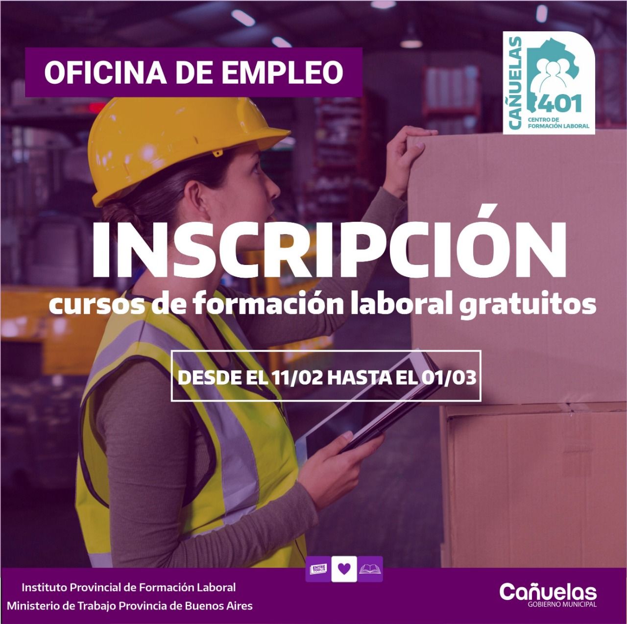 El Gobierno Municipal a través de la oficina de Empleo, invita a todos los vecinos y vecinas mayores de 18 años a inscribirse en los cursos de formación laboral gratuitos, que brindará el CFL 401 de Cañuelas junto al Instituto Provincial de Formación Laboral y el Ministerio de Trabajo de la Provincia de Buenos Aires.
