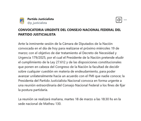 “Ante la inminente sesión de la Cámara de Diputados de la Nación convocada en el día de hoy para realizarse el próximo miércoles 19 de marzo; con el objetivo de dar tratamiento al Decreto de Necesidad y Urgencia 179/2025, por el cual el Presidente de la Nación pretende eludir el cumplimiento de la Ley 27.612 y de las disposiciones constitucionales que ponen en cabeza del Congreso de la Nación la facultad de decidir sobre cualquier cuestión en materia de endeudamiento, para poder avanzar unilateralmente hacia un acuerdo con el FMI que nadie conoce; la Presidenta del Partido Justicialista Nacional convoca en forma urgente a una reunión extraordinaria del Consejo Nacional Federal a los fines de fijar la postura partidaria”, dice el comunicado que lanzó el PJ en sus canales oficiales.