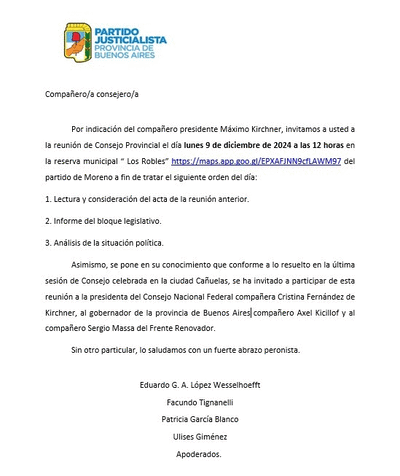 El titular del Partido Justicialista de la provincia de Buenos Aires convocó a una reunión del Consejo partidario para el próximo lunes a las 12:00 en el municipio de Moreno. Entre las personas invitadas a participar del encuentro se encuentran la expresidenta Cristina Kirchner; el gobernador bonaerense, Axel Kicillof; y el referente del Frente Renovador, Sergio Massa.