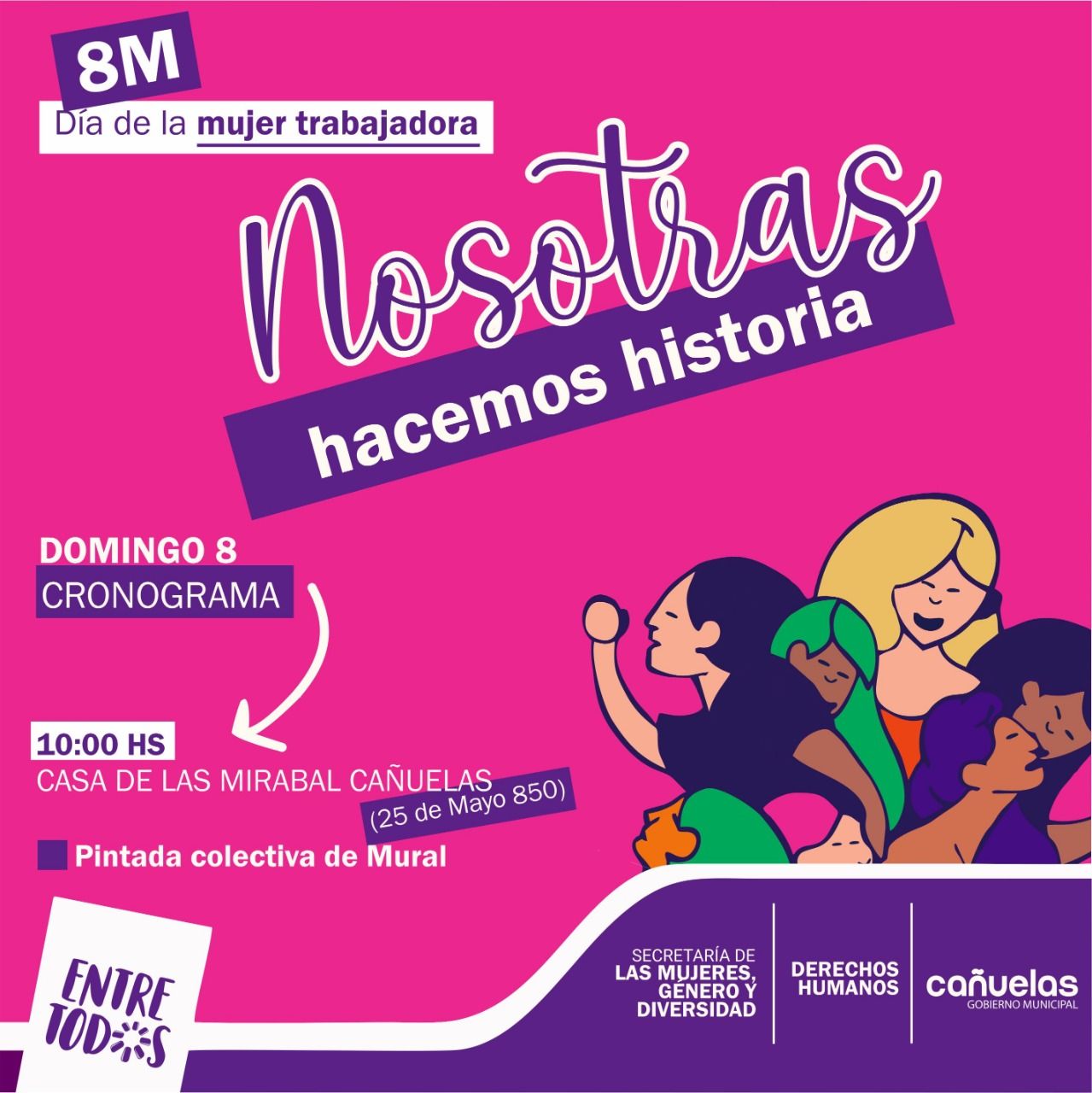 La programación comenzará el domingo 8 de marzo a las 10 de la mañana. De forma conjunta con las áreas de Derechos Humanos y Cultura, la secretaria de las Mujeres y todas las cañuelenses que deseen sumarse realizarán una pintada colectiva y abierta de un mural, en la sede de Las Mirabal, sita en 25 de Mayo 850.