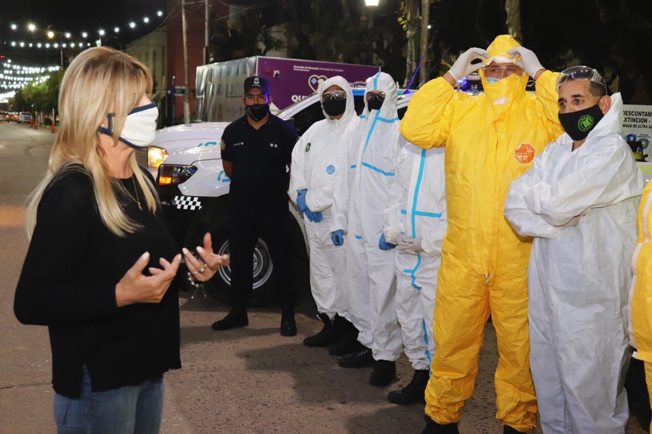 La intendenta Marisa Fassi supervisó este martes el operativo de desinfección que se realizó en diversos puntos del distrito, de forma conjunta entre el Municipio y la Dirección de Prevención Ecológica, dependiente de la Superintendencia de Seguridad Siniestral de la Policía de la Provincia de Buenos Aires.