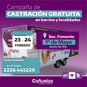 El Gobierno Municipal de forma conjunta con el Programa de tenencia responsable y sanidad animal denominado “Protenencia”, realizará castraciones para animales felinos y caninos en distintos barrios y localidades del distrito.