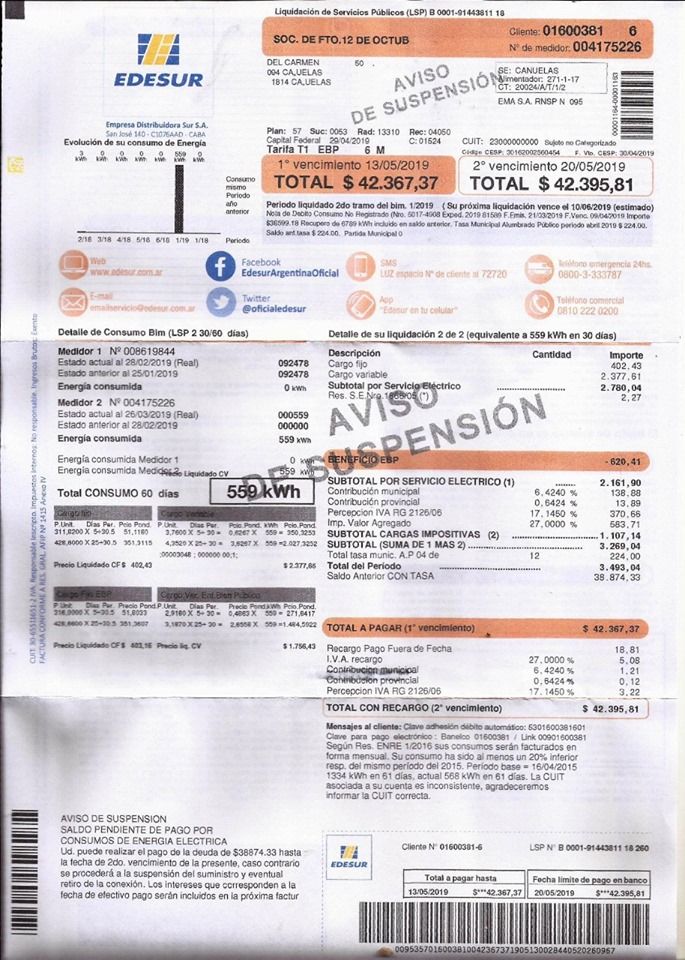 El 12 de Octubre le debe a Edesur 42 mil pesos y está acorralado por los tarifazos de Cambiemos