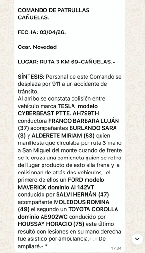 De acuerdo con el parte oficial del Comando de Patrullas de Cañuelas, difundido por la cuenta de X "LAM" (América TV) todo comenzó cuando una camioneta se cruzó de frente y luego se dio a la fuga.