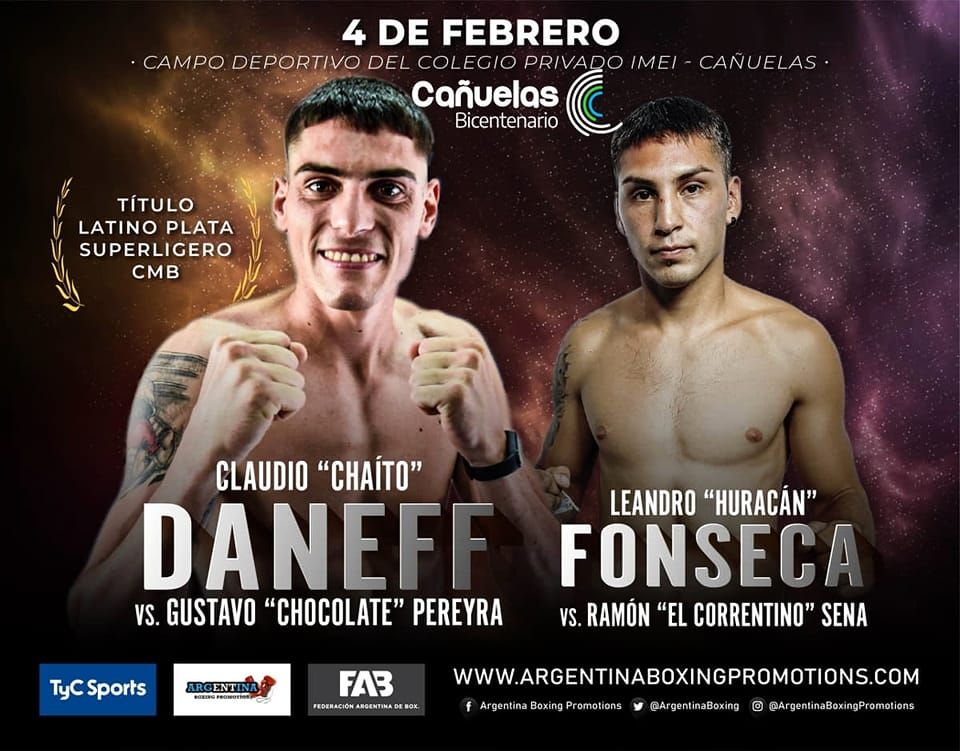Una noche con dos peleas centrales y figuras con proyección llega de la mano de Argentina Boxing Promotions por TyC Sports. El campeón argentino ligero, el bonaerense Claudio “Chaíto” Daneff, se enfrentará al salteño Gustavo “Chocolate” Pereyra.