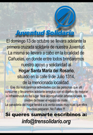 El próximo Domingo 13 de Octubre, a partir de las 10:00 hs, LA JUVENTUD SOLIDARIA (jóvenes pasajeros del TREN SOLIDARIO) eligieron el Hogar Santa María del Rosario, 9 de Juilo 1314, en nuestra localidad, como puntapie inicial de sus actividades.