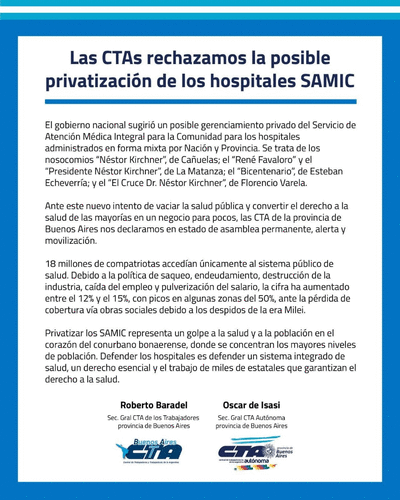 Las centrales de trabajadores de la región rechazamos la propuesta del gobierno de Javier Milei de privatizar los hospitales SAMIC (Servicio de Atención Médica Integral para la Comunidad) en la provincia de Buenos Aires.