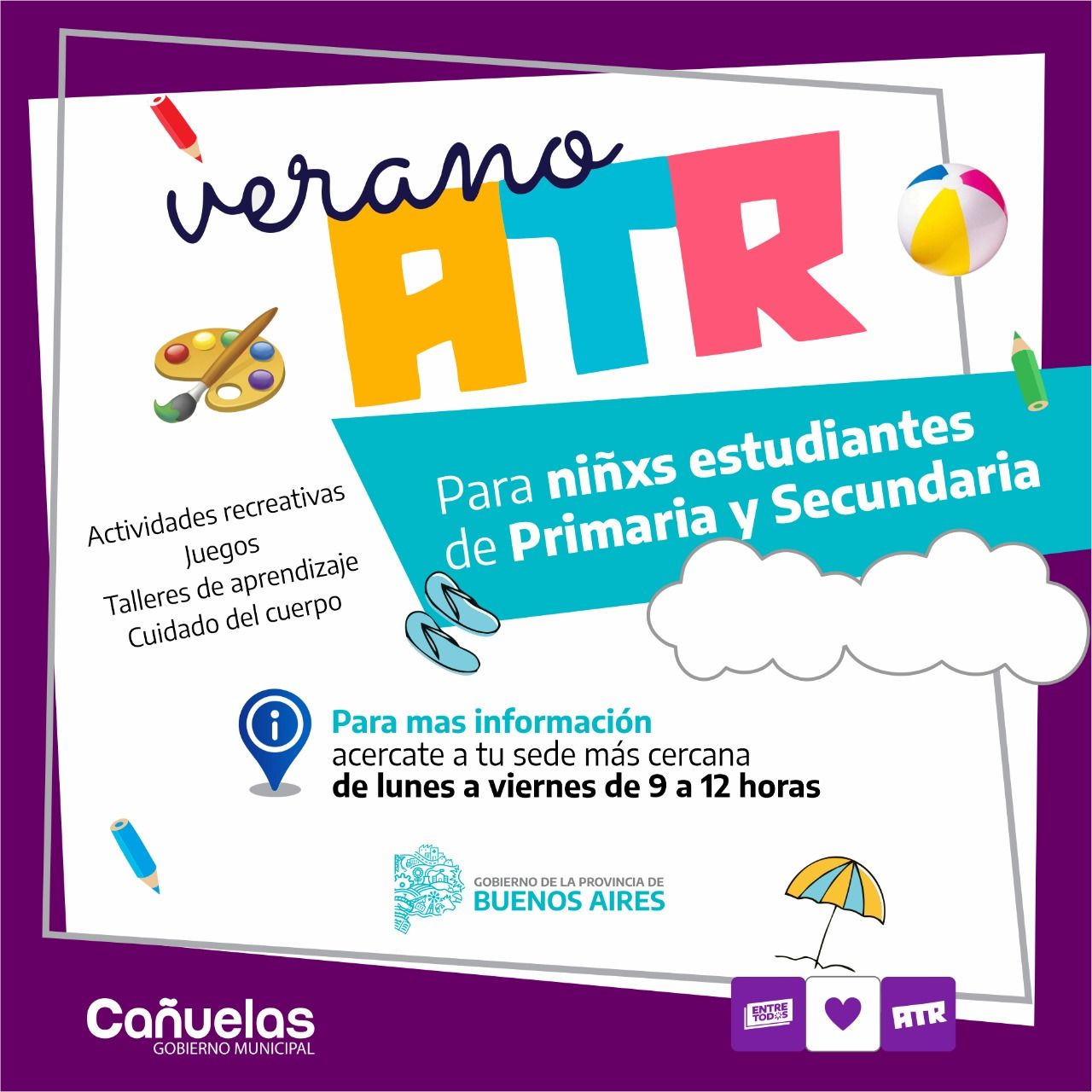 Las actividades serán de 9 a 12hs, de lunes a viernes. “Verano ATR” permitirá que los niños, niñas y adolescentes de escuelas primarias y secundarias del distrito accedan a actividades pedagógicas, de forma gratuita, durante todo el mes de enero. Para más información se encuentra a disposición el siguiente mail: veranoatrcanuelas@gmail.com