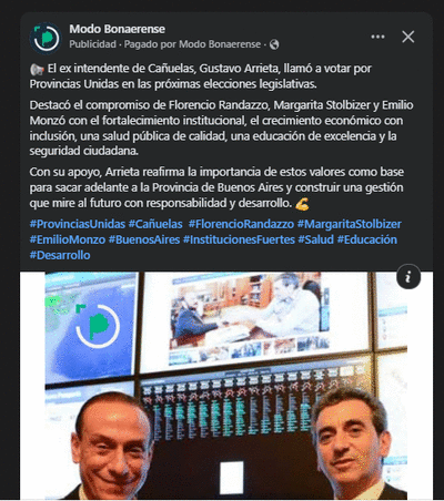 Gustavo Arrieta, parlamentario del Mercosur, rechaza y condena categóricamente una publicación falaz (fake news) difundida por la página de Facebook “Modo Bonaerense”, que se presenta como medio periodístico pero que cuenta con menos de un centenar de seguidores y que, de manera maliciosa y fraudulenta, intenta difundir información carente de toda veracidad.
