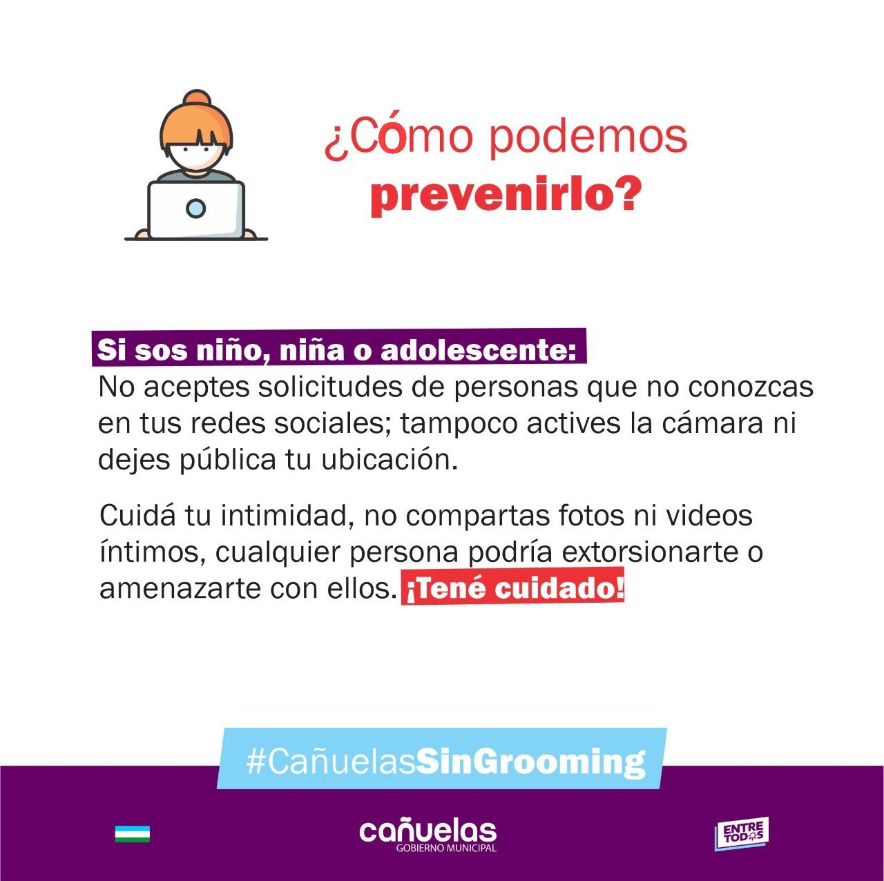 Los integrantes del programa participaron de los encuentros organizados por el Observatorio de Juventud de la Cámara de Diputados de la Nación. Desde ahí, surgió la campaña #CañuelasSinGrooming, que enfatiza en el auge que tuvo el uso de nuevas tecnologías como parte del proceso de aislamiento social, preventivo y obligatorio, y que representa una mayor exposición al grooming para niños, niñas y adolescentes.